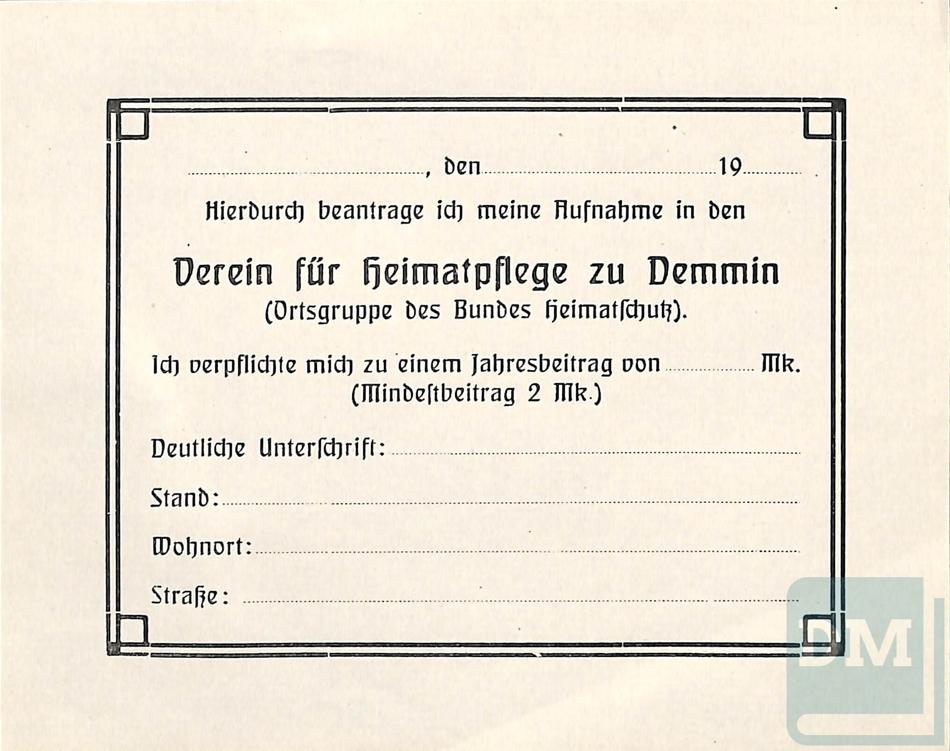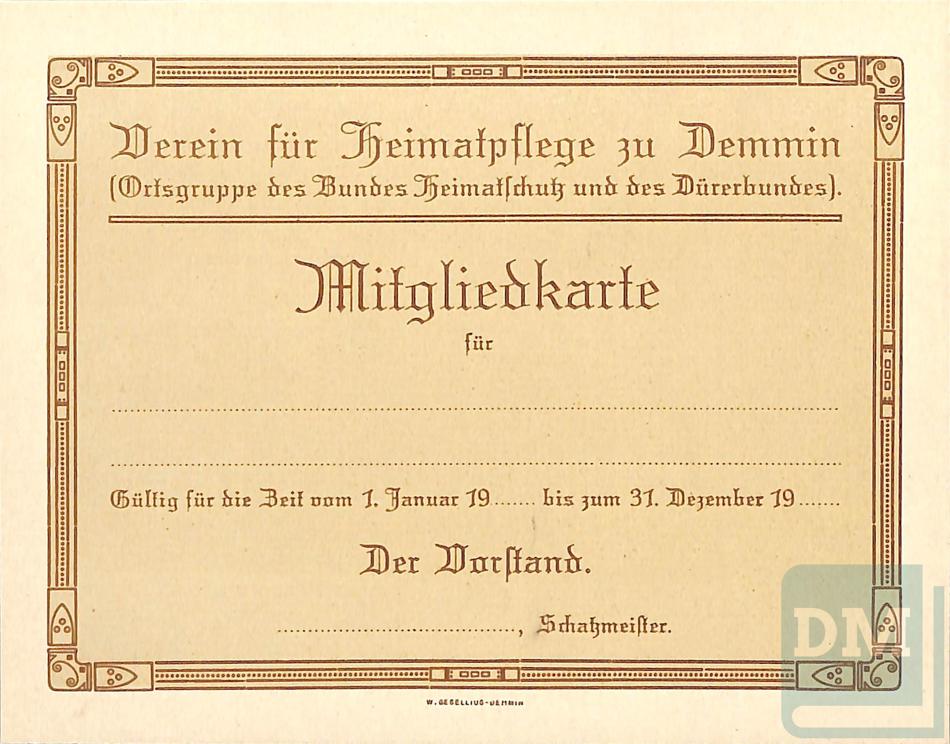 Blank membership cards for the Verein für Heimatfplege zu Demmin, which was founded by