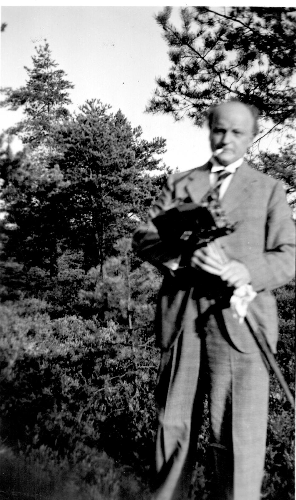 Portrait photo of Alexander Rosenbrock in the field, with his camera on tripod and cigar in mouth