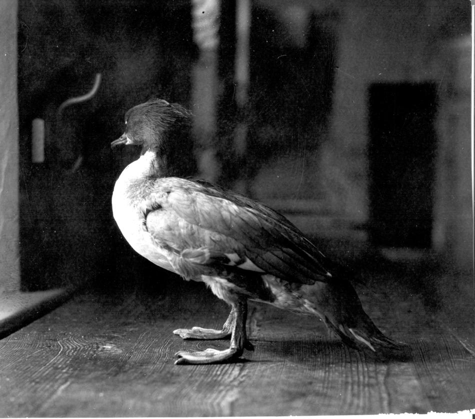 Photo of a merganser indoors, likely being rehabilitated from injury. Reverse:
