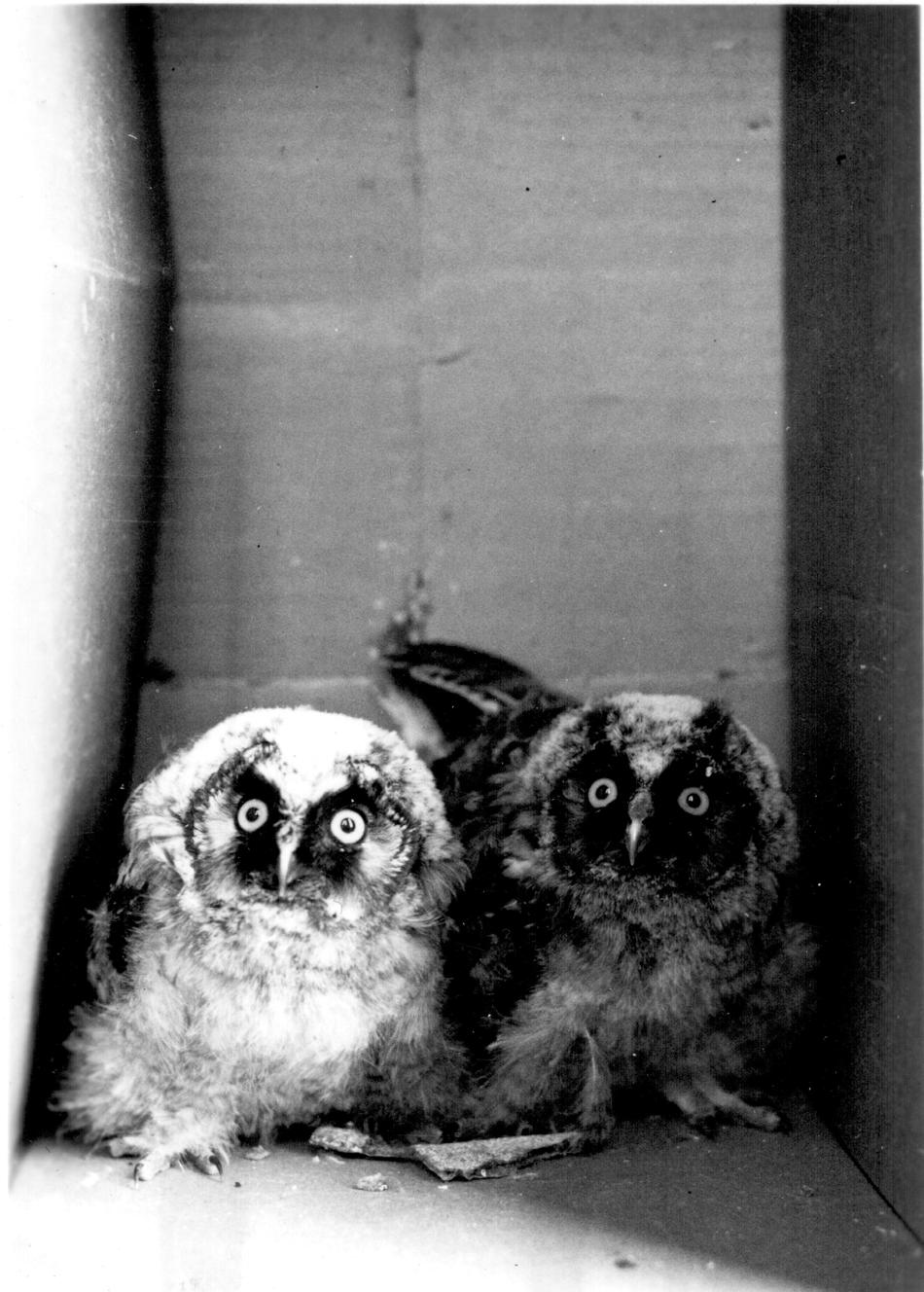 Two unidentified owl babies, possibly being rehabilitated after falling out of