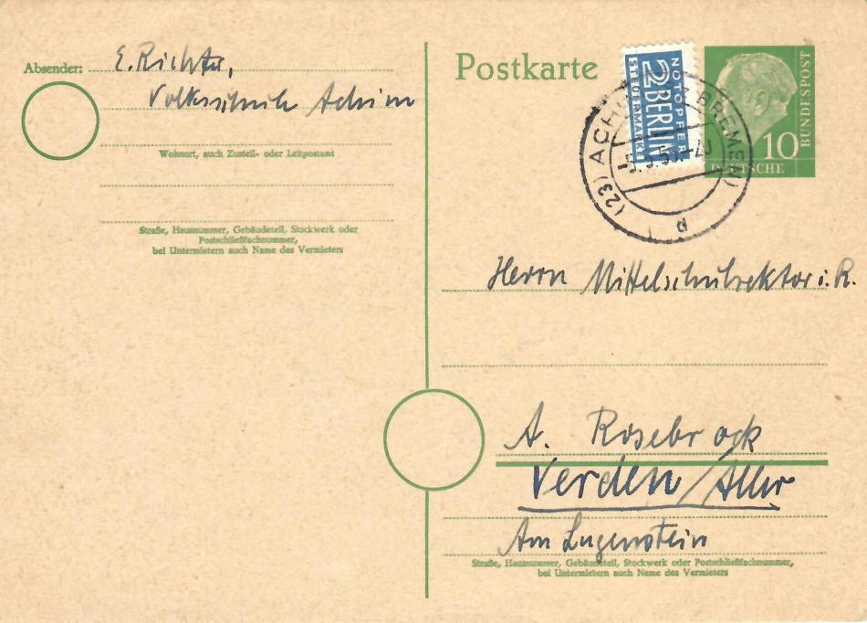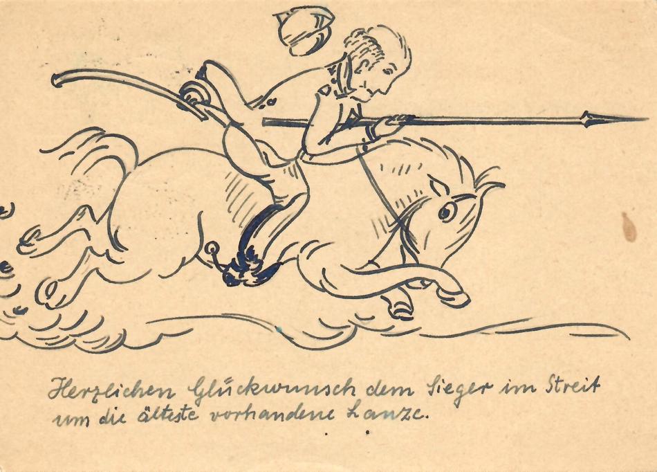 A humorously illustrated post card from an E. Richter, congratulating Alex after the Lehringer lance was returned to Verden. The text reads "Congratulations on your victory in the fight over the oldest known lance". The struggle between Alex (and Verden in general) and the regional museum in Hanover, which tried to keep the lance after originally promising to return it after conservation and initial study, made headlines and generated a great deal of sympathy in the general population, which felt that the lance should be returned to where it was found.