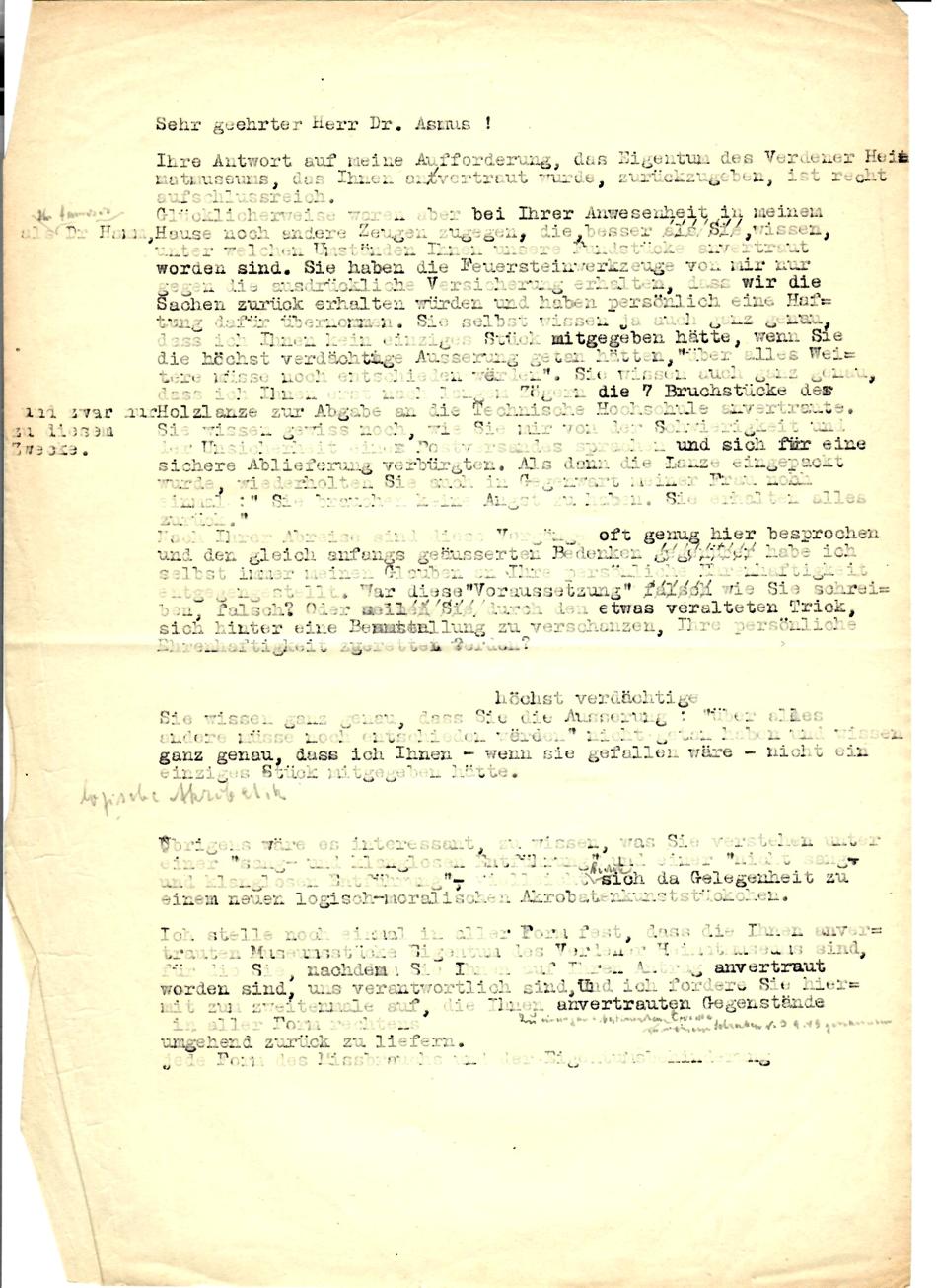 A draft of a letter to a Dr. Asmus requesting return of the lance