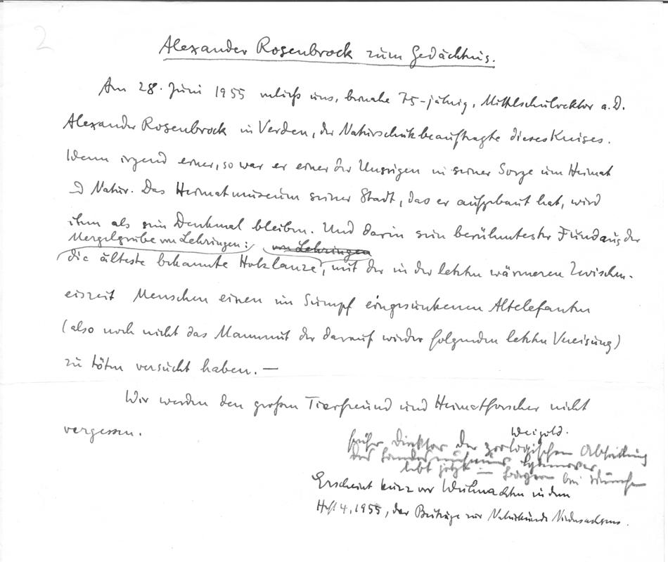 A short hand-written memorial to Alexander Rosenbrock, mentioning his
