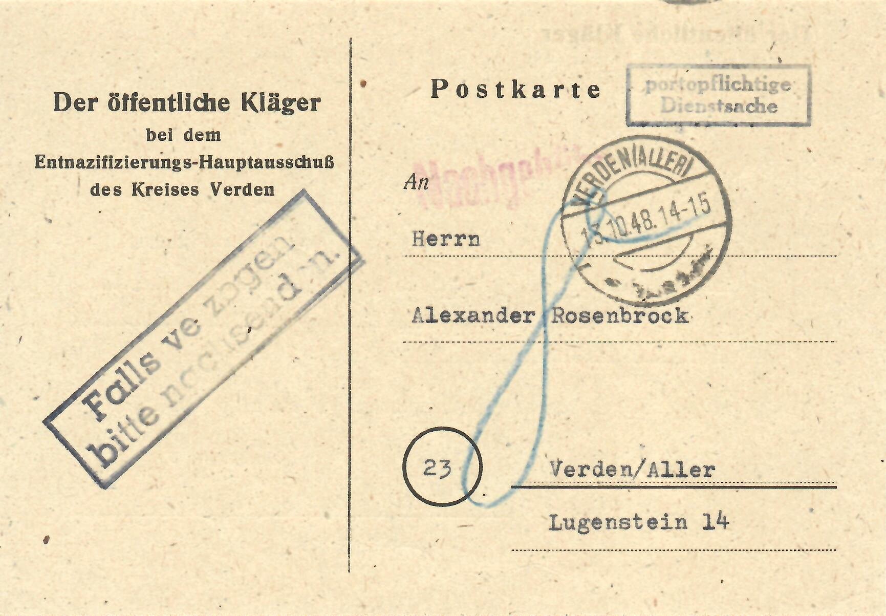 Notice post card indicating that Alexander Rosenbrock is not subject